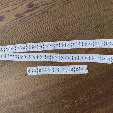 Kaksi pehmeästä langasta käsinvirkattua pitsiä. Pituudet n. 77 cm ja leveydet n. 4 cm.