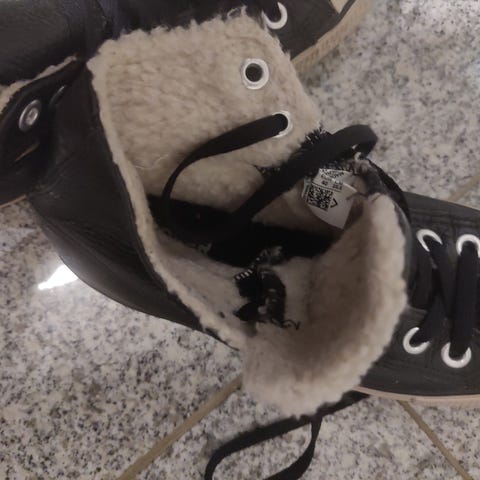 Converse talvikengät koko 40, musta väri. Päällinen nahkaa, kengissä on karvavuori(tekstiili). Korkeavartinen malli, jossa nyöritys ja tarrakiinnitys nilkan kohdalla.