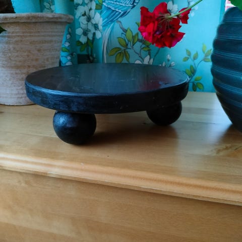 Petsilakattu mänty. Halkaisija 25 cm, korkeus 8 cm. Kolme pyöreää jalkaa.