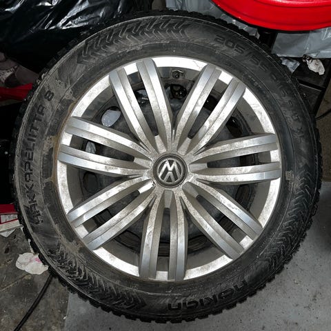 Volkkarin vanteilla nastarenkaat. Pintaa on mutta nastat huonot. Vanteiden et50