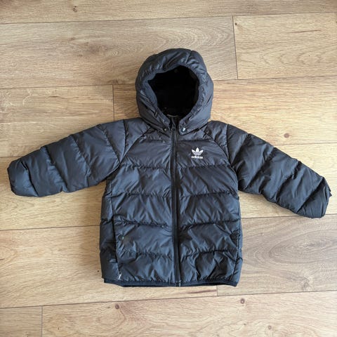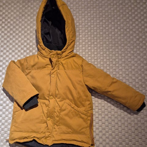 Pari kertaa käytetty lasten untuvatakki hupulla. 104 cm