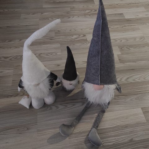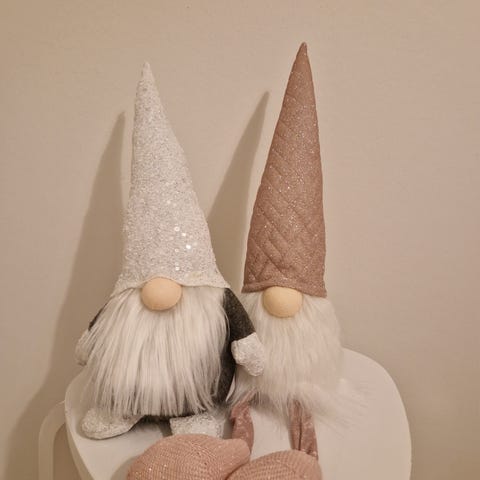 Harmaavalkoiset söpöt tontut, jotka saa roikkumaankin tonttulakeistaan! Korkeus noin 25 cm