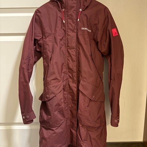 Didriksons Pitkä takki, väriltään valkoinen, naisten koko 36. Takki on pitkä malli, jossa on vetoketjulliset taskut ja säädettävä huppu. Hyväkuntoinen ja siisti. Toisessa hihassa pieni tahra, kts kuva.
