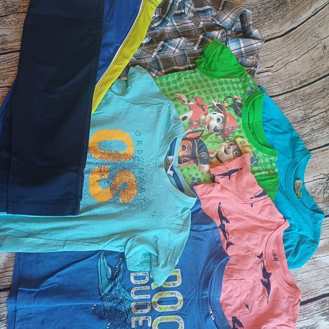 Myydään housuja ja paitoja pakettina. Pääosin 92cm, mutta mukana samaan aikaan käytössä ollutta muutama 98 vaate ja yhdet 86cm housut. Osa vaatteista on hankittu köytettynä.