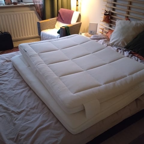 Alle vuoden vanha, nyt juuri mallistosta poistunut, moitteettomassa kunnossa oleva Ikean laadukas pääosin luonnonmateriaaleista (pellava, villa, luonnonlateksi) tehty pussijousitettu runkopatja ja kaupan päälle luonnonlateksipetauspatja.