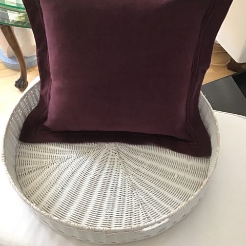 ”France Sud”, lappu leikattu irti, tuntuu 100% pellavalta, kuitusisätyyny, mitat n 45x45 cm. En muista mistä on ostettu. Ei vetoketjua, takapuolella ”halkio” josta sisätyyny laitetaan sisään.