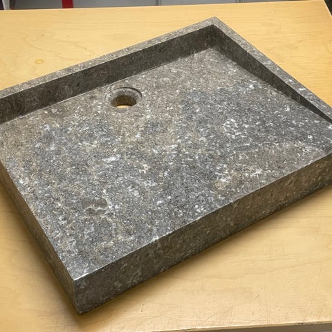 Marmoritasossa valmiiksi allas ja reikä hanalle. Toinen pitkä sivu pyöristetty. Leveyden puolesta helppo sovittaa esim. Timanttiterällä sahaten ylimääräinen pätkä pois. Pituus 166cm, leveys 51cm, paksuus 3cm.