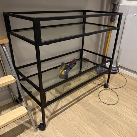 Upea kultainen baarikärry, jossa peili tasot. Neljä pulloa mahtuu vaakatasoon ja laseja roikkumaan useampia riippuen koosta. Pyörien avulla kärryä voi liikuttaa. Ollut käytössä vähän yli vuoden ja on moitteettomassa kunnossa.
