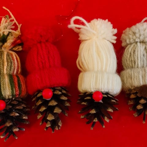 Joulukoriste tonttu punainen hattu harmaa parta kuusenkävyt