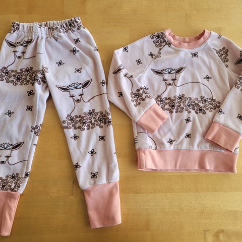 Kahdet itse ommellut velourhousut taskuilla, joissa aplikoinnit. Lahjeresoreissa mittaa kääntämiseen, eli käyttöikä ei jää heti kesken. Vyötärökuminauha on aika napakka, sopii parhaiten hoikalle lapselle. Kuivattu kuivausrummussa, eli velour on pysynyt pehmeänä.