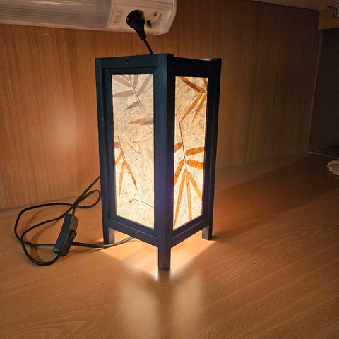 Täysin ehjä ja led-lamppu ehjä, kehikon väri kupari. Kehikon koko korkeus 24cm ja levein kohta 15cm