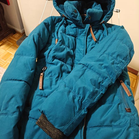 Naketanon välikausitakki. Väri ruskea, L koko. Viat näkyy kuvissa. Toinen nauhan pään koriste hävinnyt. Kauluksen keinonahkainen koriste kärsinyt pesussa. Ei haittaa käyttöä. Eikä juurikaan näy. Hihoissa parissa kohtaa vaaleat jäljet. En ole kokeillut niitä poistaa.