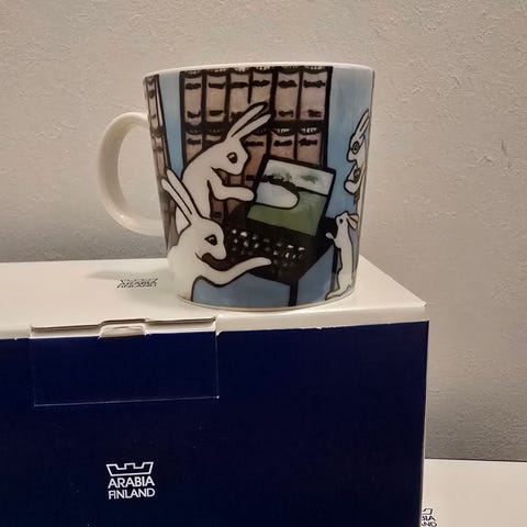 Arabian pupumuki Äitijänis, ollut tuotannossa vain vuonna 2000. Heljä Liukko-Sundströmin suunnittelema siist ja virheetön muki.