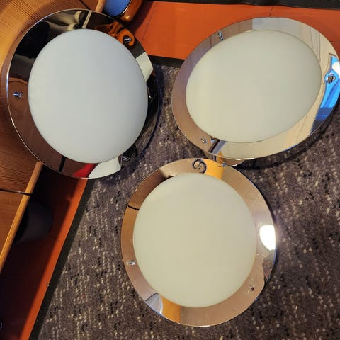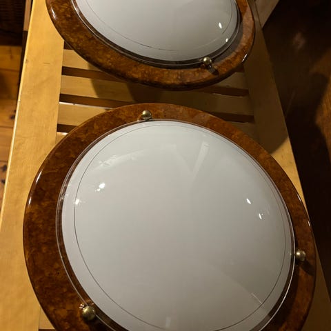 Plafondeja, koristeelliset kauniit lasikuvut. Kuvun kiinnityskohdissa pienen pieni halkeama, ei näy eikä haittaa käyttöä. Halkaisija 34cm. Katon kiinnitysraudat/koukut puuttuu. Näitä on 3 kpl. Yhteishintaan.