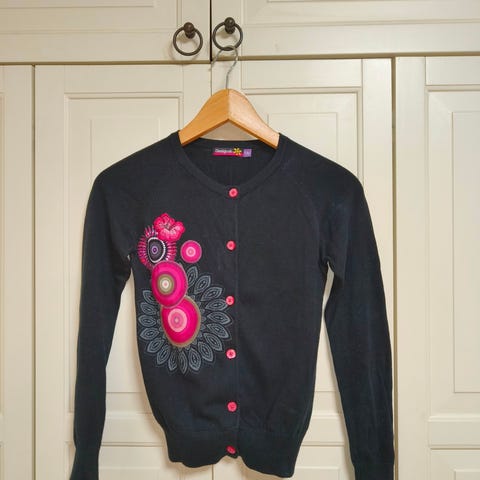 Upea merkkineuletakki. Fleece sisältä. Menee jo 134. Ylin nappi karannut. Ei haittaa käyttöä. Huomioitu hinnassa