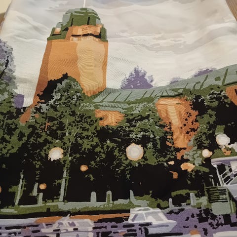 Vallila Pikku Park-verho. Itse ommeltu pituuteen 180 cm, leveys 140 cm. Paksumpaa kangasta, ei valoverho. Tankokuja. Hyvä kunto.