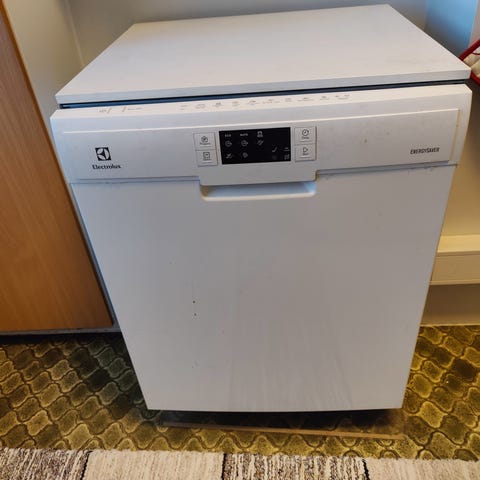AEG Eletrolux valkoinen astianpesukone Etupaneelissa painikkeet ja näyttö ohjelmien valintaa varten. Sisällä ylä- ja alakori sekä ruokailuvälinekori astioiden järjestelyyn. valitettavasti se ei sovi uuteen kotiin.