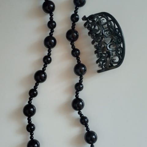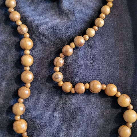 Puuhelmikaulakoru. Halkaisija: 24cm. Kuusi erillistä riviä. Käytön jälkeä. Tupakoimaton ja lemmikitön talous.