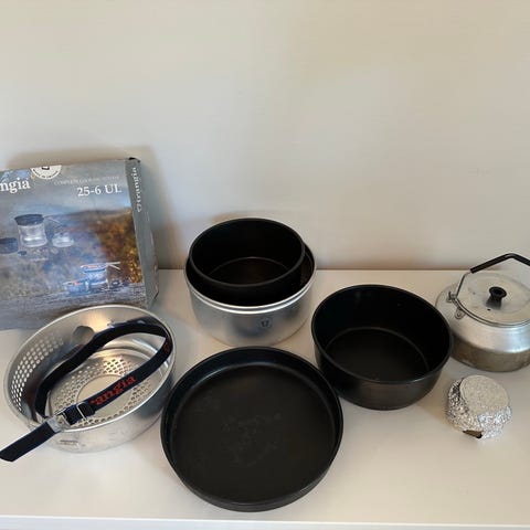Primus Trangia retkikeitin täydellä kaasupatruunalla. Sopii ulkoiluun ja retkeilyyn ja tarjoaa käytännöllisen ratkaisun ruoanlaittoon ulkona.