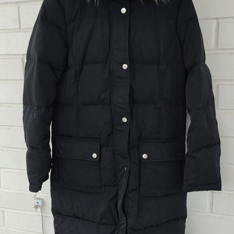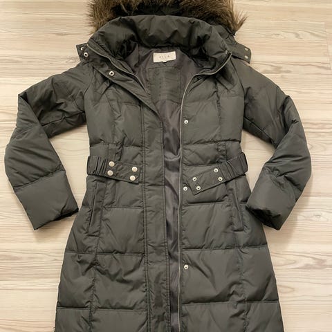 Vilan untuvatakki kokoa XS. Vetoketjullinen irrotettava karvareunallinen huppu. Aleunassa sivuilla vetoketjut, josta saa helmaa hieman levennettyä. Irrotettava, napitettava vyö. Muutaman kerran pidetty.