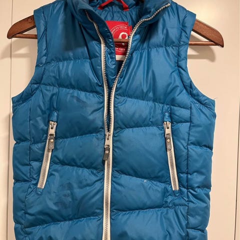 Keltainen muhkea untuvatakki, hihat irrotettavissa. Pesty hajuusteettomasti, etupuolella pinttynyttä tahraa, mutta edelleen lämmin ja pörheä.