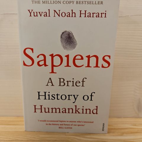 Yuval Noah Harari Sapiens kirja englanninkielinen. Teos on paksu tietokirja ihmiskunnan historiasta, jossa käsitellään lajimme kehitystä ja merkittäviä tapahtumia. Kirjan koko on tavanomainen pokkari, ja se on tarkoitettu lukijoille, jotka ovat kiinnostuneita historiasta ja antropologiasta.