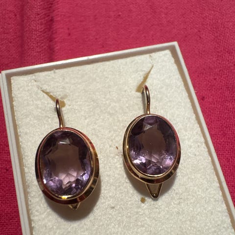 Lähes käyttämätön setti sormus 14karaatin kultaa ametistikivi koko 17 mm korvakorut sama materiaali.