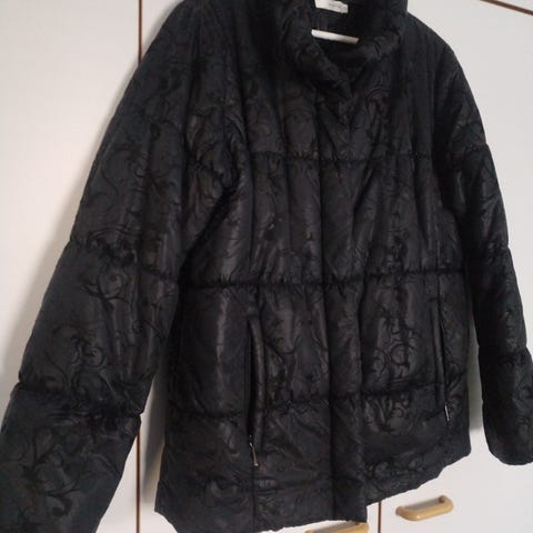 Musta lämmin takki,jossa edessä vetoketjukiinnitys,kaksi taskua. Pituus olkapäältä 83cm .
