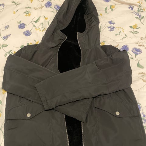 Musta puolipitkä takki Vero Modasta. Edessä taskut. Sidottava vyötäröltä. Pinta vähän nukkaantunut läheltä tarkasteltaessa.