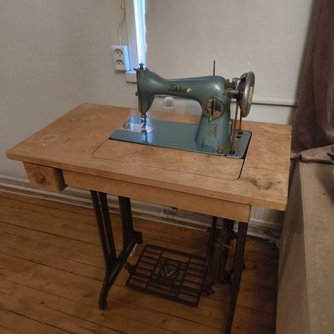 Hyvässä kunnossa oleva vanha ompelukone ja pöytä. Ohjeetkin mukana.