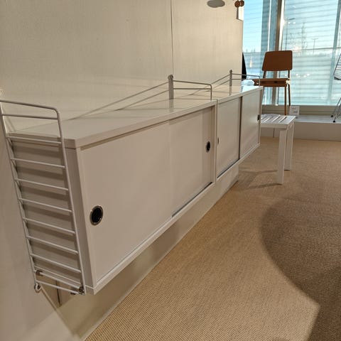 String-kaappi on String System -hyllyjärjestelmään kiinnitettävä kaappi. Kaapissa säilöt kaiken tarpeellisen tavaran papereista leluihin ja arvotavaroihin.
