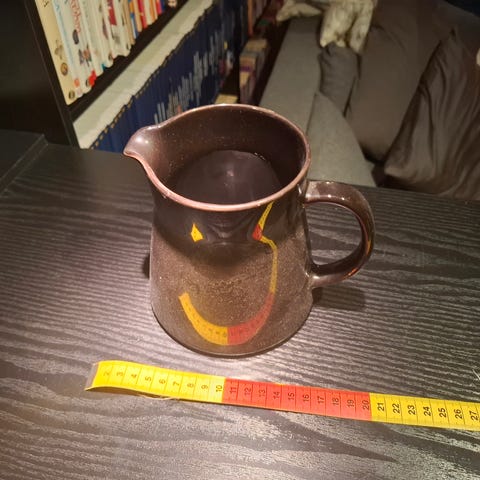 Hyvässä kunnossa oleva ja puhdas muovikannu/maitokannu. Korkeus 25 cm, halkaisija alhaalta 14 cm. Mielellään nouto.