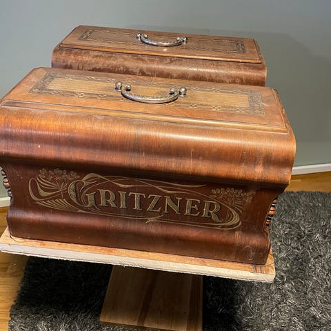 Myydään kaksi samanlaista ompelukonekoristeista säilytysrasiaa. Ehjiä, keveitä, siistejä. Rasia ruskeaksi käsiteltyä puuta, ompelukone musta-hopea-kulta -maalattua muovia tai kevytmetallia. Salpa metallia. Rasian ulkomitat; leveys 24,5 cm, syvyys 16 cm ja korkeus 10 cm. Ompelukoneen korkeus 11 cm. Hinta 10 €/kpl.
