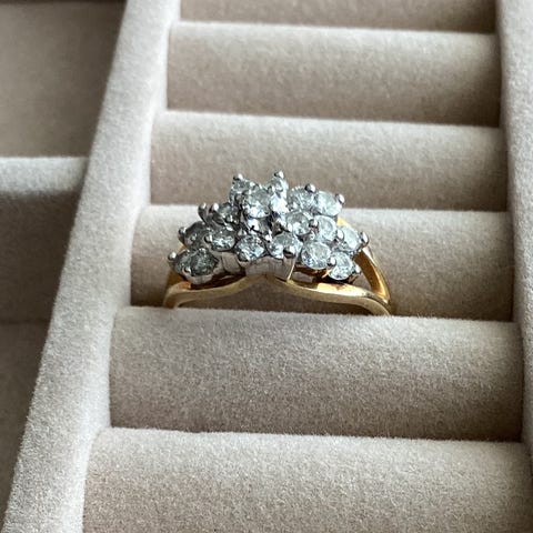 Timantit ovat pienet, sormus on siro, mutta samalla näyttävä. 9 kiveä. keskirivillä hieman suuremmat timantit. Sormus 14k kultaa.