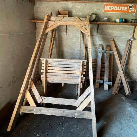 Annetaan kohtalaisessa kunnossa oleva vastakkainistuttava pihakeinu. Säilytetty katoksessa.