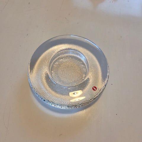 Markku Salon Iittalalle suunnittelema kirkas Nappi kynttilälyhty. Lyhdyn halkaisija on 12,5 cm ja korkeus 2,5 cm.