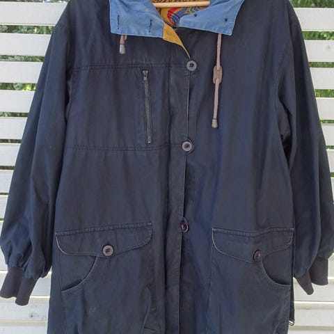 Gudrun Sjödén pitkä takki mustassa värissä, naisten kokoon M, mutta mielestäni enemmän L-kokoa. Takissa on koristeellisia kirjailuja ja kuvioita, sekä huppu. Materiaalit ja yksityiskohdat näkyvät kuvissa. Takki on puuvillaa ja puuvillavuoritettu. Sopii kevät tai syystakiksi.
