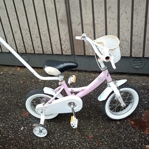 Pinepeak lasten polkupyörä, 16 tuuman renkailla. Runko on sininen ja valkoinen, satula on valkoinen ja pinkki. Pyörä sopii lapsille ja siinä on ketjusuoja turvallisuuden lisäämiseksi.