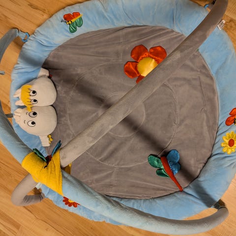 Hyväkuntoinen leikkimatto. Ei enää uudenveroinen. Mutta tosi hyvin menee vielä seuraavalle. Ainoa vika minkä löysin on vikoissa kuvissa näkyvä peili kukka mikä on hieman revennyt.