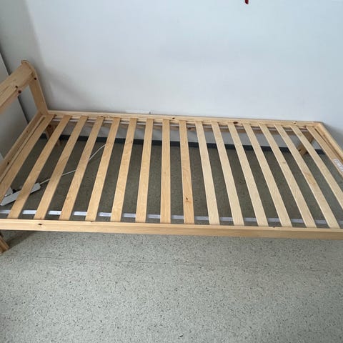 Jysk Abildro-sängynrunko sälepohjalla. Patja ja patjansuojus kaupan päälle.