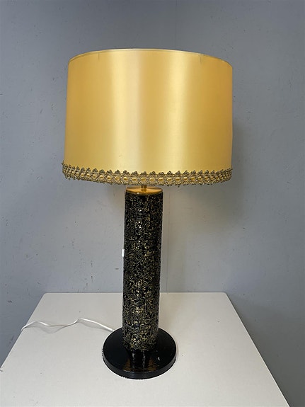 Tyylikäs vintage pöytävalaisin, jossa on keraaminen jalka. Valaisimen pinta on mielenkiintoisesti krakeloituneella kuvioinnilla, mikä antaa sille ainutlaatuisen ilmeen. Yläosassa on messinkinen yksityiskohta, joka tuo kontrastia valaisimen vaaleaan sävyyn. Valmistajaa ei tunnistettu.