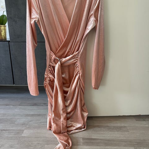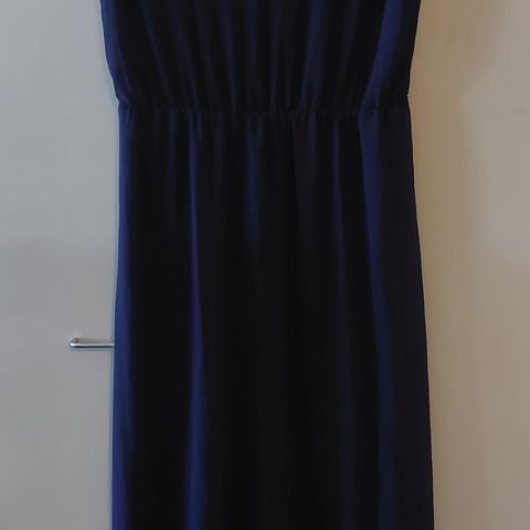 Bik Bokin tummansininen juhlamekko, koko L. Puvussa on lyhyet hihat ja V-aukko sekä vyötäröltä laskostettu helma. Materiaalina on kevyt ja läpikuultava kangas, joka sopii juhla- ja iltatilaisuuksiin.