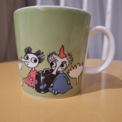 Myydään Tiuhti ja Viuhti- muumimuki. Mukin ylälaidassa ei ole valumaa tmv. vikaa. Varjo tulee hassusti. Yhdessä kukista ei ole yhtenäinen viiva, lasitteessa ei ole kuitenkaan virhettä/naarmuja. Kruunuleima, ollut tuotannossa tuolla pohjaleimalla 2005-2014.