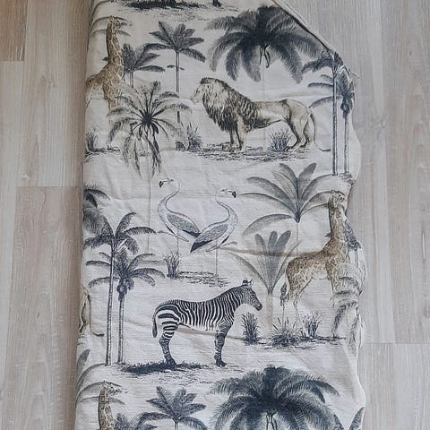 Kankaana Paapiin Siiri ja Myyry puuvilla. Tässä joku pieni tahra, jota en ole koittanut enempää puhdistaa (saattanut tullakin säilytyksessä eli voi puhdistua ihan normaalilla pesulla).