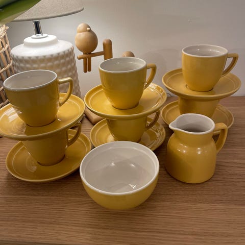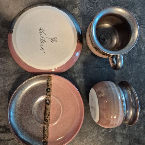 Myyn muuton alta pois uuden veroiset Kerman saven kahvikupit aluslautasineen. Kahvikuppeja on 5 kpl, alustasseja 6 kpl ja leivoslautasia 6 kpl.