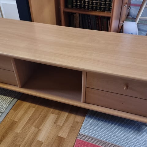 TV-taso, kolme kaappia säilytystilaa varten kahdessa lasi-ovi. Maalattu mustaksi. Materiaali puuta.