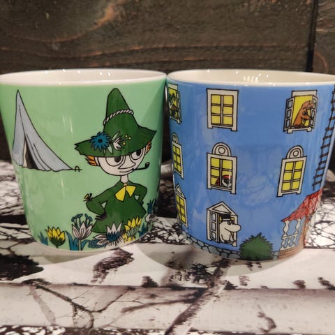 Täysin käyttämättömät muumimukit. Muumitalo muki on posliinia. Valkoinen muumi cambing muki on kovaa muovia.