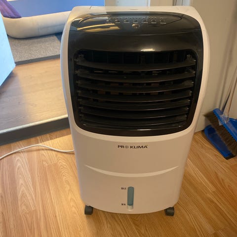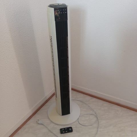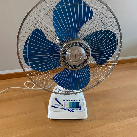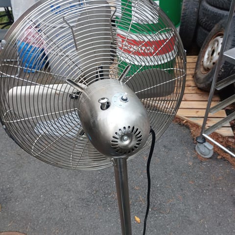 Omalla jalalla seisova tuuletin, jossa 3 eri pyörimisnopeutta. Puhaltimen saa liikkumaan (pyörimään akselinsa ympäri) n 90°. Korkeus 1,2m. Puhaltimen siipiväli 38cm.