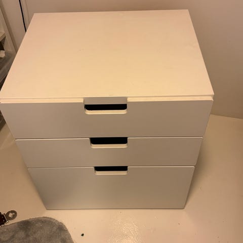 Hyväkuntoinen kolmen korin laatikosto. Laatikosto takana pienent pyörät niin helppo liikutella.