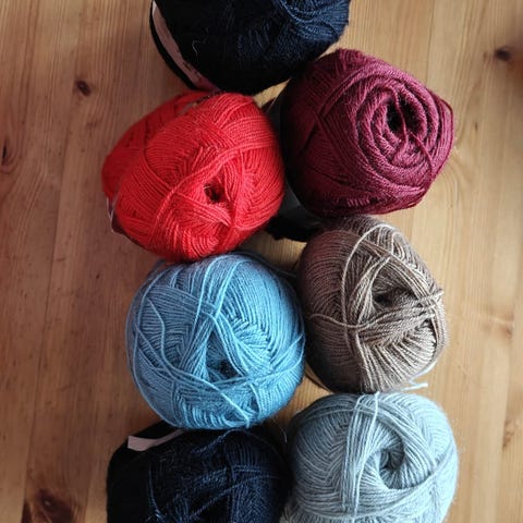 Marjapuuronpunainen villalanka, yhteensä 950g. 100% villa. Kaikki langat samaa värierää.